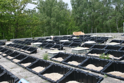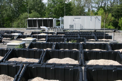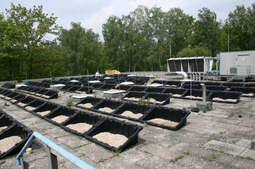 Am 29. Mai 2010 wurden die Montagewannen auf dem Dach verteilt und mit Kies beschwert